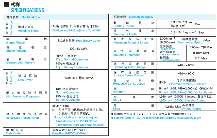 - 17bit/1轉(zhuǎn),多回轉(zhuǎn)16bit(6, 000rpm Max)